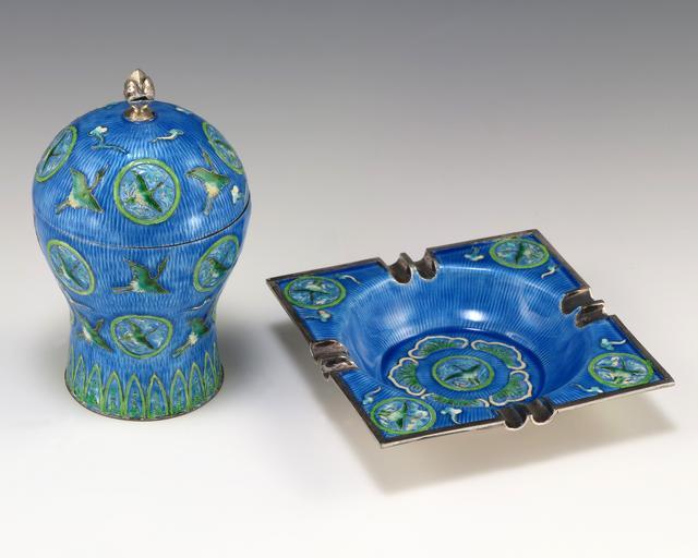 MAKE A MEME View Large Image State Gifts Enameled Smoking Set.JPG en An enameled metal ashtray and cigarette container with blue and green enamel depicting a flying bird motif Gift of Mr Heung-Moon Koh Congressman Republic of Korea enamel 5 H Institution Gerald R Ford ...