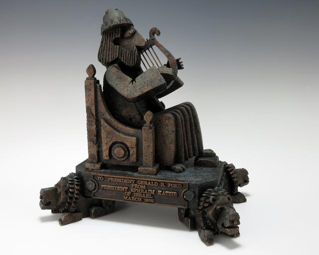 Keywords: State Gifts Sculpture.JPG en Contemporary bronze sculpture depicting King David playing a harp while seated at his throne The statue is mounted on a square base with four sculpted lions serving as feet for the base of the throne The artist Frank Meisler engraved his name at the base There are two plaques mounted to opposite sides of the base with the words To President Gerald R Ford from President Ephraim Katzir of Israel March 1975 in both English and Hebrew Gift of President Ephraim Katzir of Israel bronze 15 H x 12 5 W Institution Gerald R Ford Presidential Museum http //www fordlibrarymuseum gov/museum/ArtifactCollectionSamples/Catagories/StateGifts/IsraeliSculpture html Bronze sculpture accession number 1987 108 1 credit line Courtesy of the Gerald R Ford Presidential Museum Donation Date March 5 1975 Institution Institution Gerald R Ford Presidential Museum Gerald R Ford Presidential Library and Museum-cooperation PD-USGov Uploaded with UploadWizard Gifts of heads of state in the Gerald R Ford Presidential Museum Sculptures of David Relations of Israel and the United States |