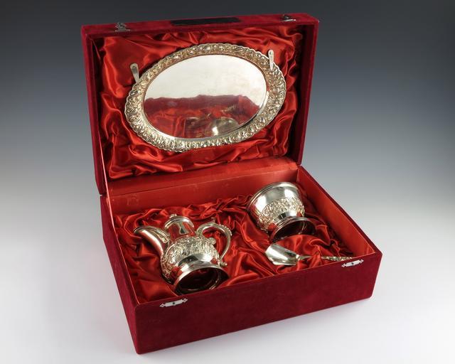 | Keywords: State Gifts Silver Tea Service.JPG en This silver tea set includes a tray teapot with removable lid spoon and sugar cup with removable lid Each piece features a relief floral design The tea set is housed in a red velvet covered presentation box The outside lid features a golden emblem of Indonesia and a brass plaque Gift of Vice President Sri Sultan Hamegku Buwono IX of Indonesia silver 5 H x 13 5 W x 9 5 D Institution Gerald R Ford Presidential Museum http //www fordlibrarymuseum gov/museum/ArtifactCollectionSamples/Catagories/StateGifts/TeaSet html Tea service accession number 1982 91 1-4 credit line Courtesy of the Gerald R Ford Presidential Museum Donation Date July 1974 Institution Institution Gerald R Ford Presidential Museum Gerald R Ford Presidential Library and Museum-cooperation PD-USGov Uploaded with UploadWizard Gifts of heads of state in the Gerald R Ford Presidential Museum Tea sets Relations of Indonesia and the United States |