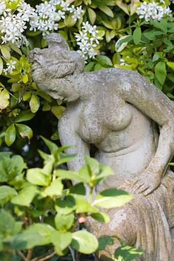 Keywords: state woman lady garden garden statue female girl old aged foliage green shrubs plants flowers photo image
