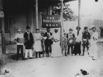 | Keywords: StateLibQld 1 100868.jpg en Bung-Em-Up Band Cooktown ca 1909 Portrait of the Bung-Em-Up Band Cooktown taken in the street in front of the verandah of a two-storey building The members are in costume and hold musical instruments including an accordion trumpet and various percussion instruments Two young boys hold a banner bearing the name of the group ~ 1909 handle 10462/deriv/69477 Item is held by John Oxley Library State Library of Queensland PD-Australia StateLibQld-License People of Cooktown Queensland |