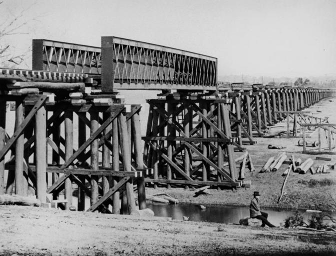 Keywords: StateLibQld 1 103526 Condamine River Railway Bridge, Warwick district, 1882.jpg en Condamine River Railway Bridge Warwick district 1882 Wooden trestle railway bridge crossing the river plains outside Warwick This is the longest bridge on the southern line Its total length when built was 1979 feet 6 inches and includes one 100 ft iron girder span over the river and eighty-seven 20 ft spans the twenty-sixes having double and the twenties single wooden girders It was officially opened on 5th May 1880 1882 handle 10462/deriv/90748 Item is held by John Oxley Library State Library of Queensland PD-Australia StateLibQld-License Railway bridges in Queensland Wooden bridges in Australia Condamine River Warwick Queensland 1882 in Queensland Black and white photographs Southern railway line Queensland |