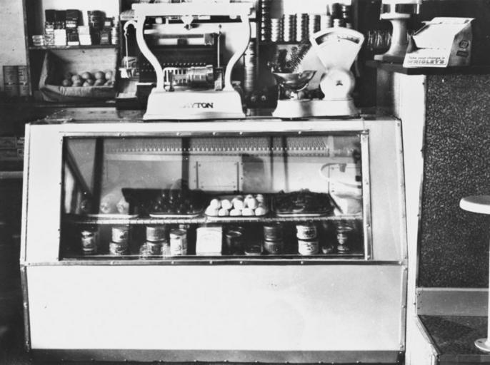 Keywords: StateLibQld 1 105856 Refrigerated cabinet in a shop at Roma, ca. 1935.jpg en Refrigerated cabinet in a shop at Roma ca 1935 Two shelves full of food can be seen inside the cabinet and two sets of scales are sitting on the counter Shelves stocked with merchandise can be seen behind the counter circa 1935 handle 10462/deriv/93177 Item is held by John Oxley Library State Library of Queensland PD-Australia StateLibQld-License Food sales counters 1935 ca Interiors of shops in Australia General stores in Queensland Black and white photographs Refrigerators in supermarkets