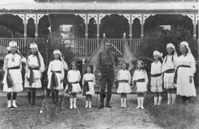 Keywords: StateLibQld 1 111132 Portrait of the Charters Towers Junior Red Cross Group, ca. 1917.jpg en Portrait of the Charters Towers Junior Red Cross Group ca 1917 <br /> Portrait of the Charters Towers Junior Red Cross Group posing on the grass in front of a house A man in military uniform poses in the centre of the group and has a cane The girls wear headgear inscribed with their battalion dresses sashes around the waist shoes and socks The verandah balustrade and awning is prominent behind the group circa 1917 handle 10462/deriv/131567 Item is held by John Oxley Library State Library of Queensland PD-Australia StateLibQld-License Children of Queensland Groups of people in Australia 1910s in Australian society People of Charters Towers 1917 in Queensland Red Cross in Australia Black and white photographs Red Cross uniforms |