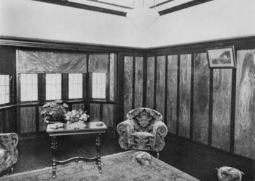 Keywords: StateLibQld 1 113080 Red Tulip Oak plywood panelling used in a Brisbane residence, ca. 1933.jpg en Red Tulip Oak plywood panelling used in a Brisbane residence ca 1933 The oak panelling is on both walls of the room A patterned carpet square is centred on the timber floor The chairs are highly patterned and a matching round footstool sits in front of one of the chairs There is a small polished timber coffee table with wood-turned legs standing between two chairs circa 1933 handle 10462/deriv/133213 Copied and digitised from The Veneer and Plywood Industry of Queensland December 1933 p 36 PD-Australia StateLibQld-License Rooms in Australia Furniture in Australia Interior decoration in Australia Houses in Brisbane Black and white photographs
