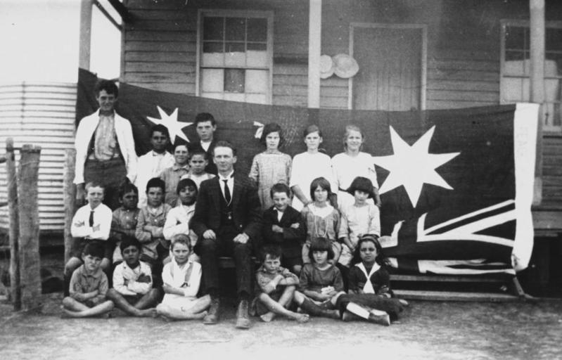 | Keywords: StateLibQld 1 113620 Head teacher and pupils outside Hebel State School, 1920.jpg en Head teacher and pupils outside Hebel State School 1920 P A Cagow head teacher is sitting in the centre The Australian Flag is hanging upside down and back-to-front 1920 handle 10462/deriv/138752 Item is held by John Oxley Library State Library of Queensland PD-Australia StateLibQld-License School children of Queensland Educators from Australia Children's clothing of Australia Photographs of flags of Australia 1920 in Australia Black and white photographs |