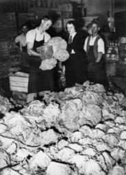 | Keywords: StateLibQld 1 126887 Selling cabbages at the Brisbane Roma Street Markets, ca. 1937.jpg en Selling cabbages at the Brisbane Roma Street Markets ca 1937 Young man displaying a cabbage to an interested woman at the markets circa 1937 handle 10462/deriv/81449 Item is held by John Oxley Library State Library of Queensland PD-Australia StateLibQld-License Men's clothing of Australia Women's clothing of Australia Cabbage 1937 in Brisbane Black and white photographs | ||||