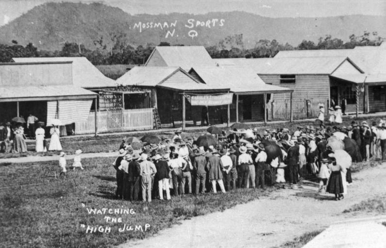 Keywords: StateLibQld 1 129469 Crowd watching the high jump at Mossman, Queensland, 1910.jpg en Crowd watching the high jump at Mossman Queensland 1910 The group is assembled on the grass in front of the shops Some members of the crowd shade themselves with umbrellas The store Earsley Storekeeper is in the centre of the group of shops The hills and trees are visible in the background beyond the town 1910 handle 10462/deriv/82980 Item is held by John Oxley Library State Library of Queensland PD-Australia StateLibQld-License Children of Queensland Sports in Australia Recreation in Australia Crowds in Queensland Mossman Queensland 1910 in Australia Black and white photographs |
