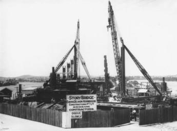 Keywords: StateLibQld 1 129537 Story Bridge under construction, Brisbane, ca. 1936.jpg en Story Bridge under construction Brisbane ca 1936 View of the fenced-off yards of Evans Deakin-Hornibrook Constructions Pty Ltd Evans Deakin and M R Hornibrook Pty Ltd were the contractors responsible for building the Story Bridge between 1935 and 1940 On the building site cranes are being used to lift steel trusses and other materials circa 1936 handle 10462/deriv/78262 Item is held by John Oxley Library State Library of Queensland PD-Australia StateLibQld-License Workers in Australia Overhead cranes in Australia Story Bridge construction Black and white photographs |