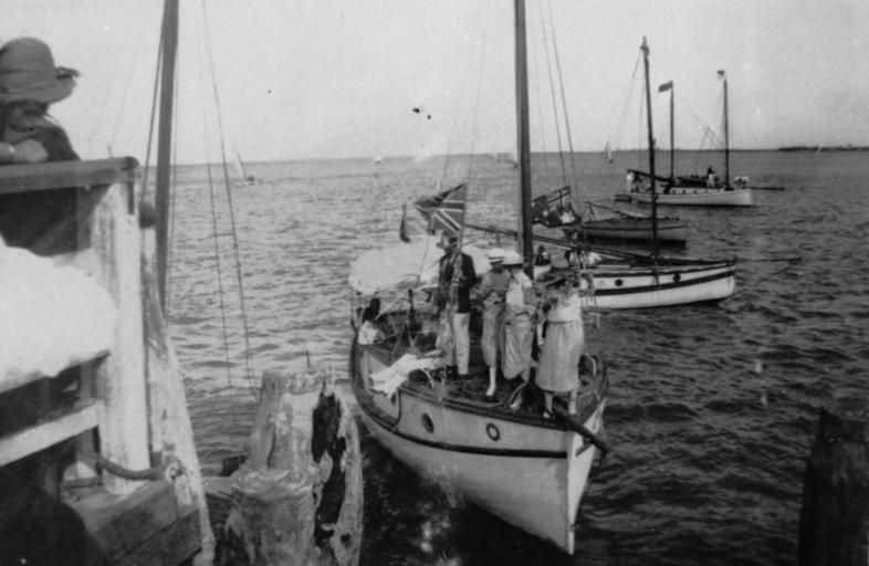 | Keywords: StateLibQld 1 131803 Opening the Sandgate Sailing Club in 1922.jpg en Opening the Sandgate Sailing Club in 1922 Yachts decorated with flags moored off the jetty at Sandgate The front vessel is the Roberta and has a sun canopy on the aft deck and flags flying from the mainstay Three women on the bow are dressed in 1920s fashionable dresses and hats The boat was built by Albert Drew 1922-09-26 handle 10462/deriv/78662 Item is held by John Oxley Library State Library of Queensland PD-Australia StateLibQld-License Wharves and quays in Australia Sandgate Queensland 1922 in Australia Sailing yachts of Australia Women's clothing of Australia Black and white photographs |