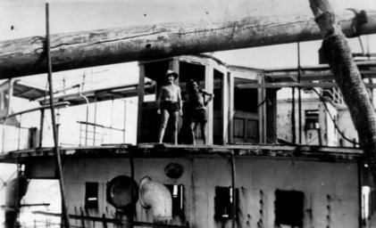 | Keywords: StateLibQld 1 14450 Two workers on the deck of the Maheno.jpg en Two workers on the deck of the Maheno The wreck of the Maheno now lies on the beach at Fraser Island Queensland handle 10462/deriv/146572 Item is held by John Oxley Library State Library of Queensland PD-Australia StateLibQld-License Shipwreck of Maheno ship 1905 Ships in Queensland Black and white photographs | ||||