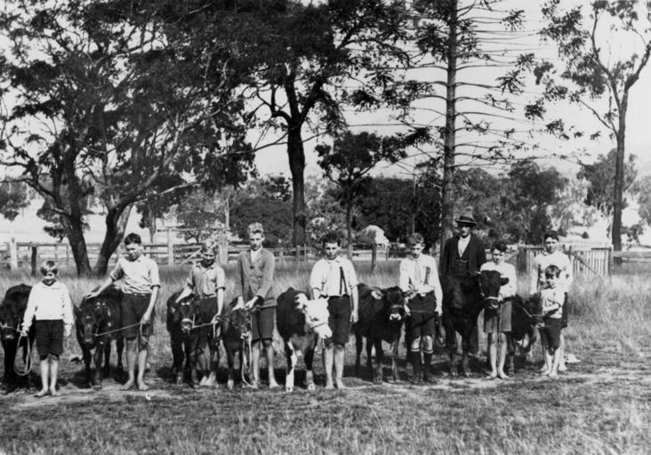 Keywords: StateLibQld 1 148571 Members of the Tiaro School Calf Club, Queensland, with their calves, ca. 1930.jpg en Members of the Tiaro School Calf Club Queensland with their calves ca 1930 From left to right they are Peter Scougall Geoff Murray Phil Cornwell Bernard Schellback Mervyn Price Lorne Purser Frank Purser Bill Ernst Eric Ernst Percy Rollinson Mervyn Price and Lorne Purser wear ribbons that they have won The boys stand in a line in a field circa 1930 handle 10462/deriv/24204 Item is held by John Oxley Library State Library of Queensland PD-Australia StateLibQld-License Children of Queensland Cattle in Australia Groups of people in Australia State schools in Queensland Tiaro Queensland 1930 in Queensland Black and white photographs |