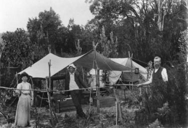 Keywords: StateLibQld 1 157505 Christmas camp at Bulwer, Moreton Island, 1907.jpg en Christmas camp at Bulwer Moreton Island 1907 A tent and a canvas awning have been erected on poles and are surrounded by a cut pole fence Two men and a lady are posing for the camera Boxes of supplies are sitting on the ground under the canvas awning protected from the weather 1907-12-01 handle 10462/deriv/4258 Item is held by John Oxley Library State Library of Queensland PD-Australia StateLibQld-License Beaches of Queensland Moreton Island 1907 in Australia Tents in Australia Women's clothing of Australia Men's clothing of Australia Black and white photographs |