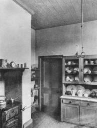 | Keywords: StateLibQld 1 15926 Interior view of a kitchen in 1906.jpg en Interior view of a kitchen in 1906 The kitchen has a combustion stove set into an alcove on the left and a timber cabinet full of china to the right A light fitting is hanging from the ceiling The room was featured in a magazine 1906 handle 10462/deriv/429 Item is held by John Oxley Library State Library of Queensland PD-Australia StateLibQld-License Kitchen furniture Sideboards China cabinets Kitchens in Australia 1906 in Queensland Black and white photographs |