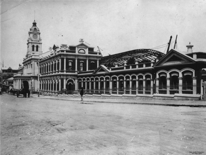 Keywords: StateLibQld 1 163007 Central Railway Station Brisbane, Queensland, 1901.jpg en Central Railway Station Brisbane Queensland 1901 Central Railway Station and clock tower in Ann Street Brisbane The double storey sandstone construction has moulded arches over the windows and doors with gable decorations on the roof 'The above represents the elevation of the Brisbane Central Railway Station according to the approved design upon which the tender has been accepted Built in ca 1901 the building has standstone facings from Helidon pink stone from Pearson's quarry and white stone from Pippard's quarry The building was taken over by the department on the 26 July 1901 at a cost of forty nine thousand two hundred and seventy seven pounds fifteen shillings and eleven pence' Information taken from Evening Observer 13 May 1889; and Votes and proceedings v 4 1909 1901 handle 10462/deriv/110254 Item is held by John Oxley Library State Library of Queensland PD-Australia StateLibQld-License Central railway station Brisbane Ann Street Brisbane 1901 in Brisbane Black and white photographs |