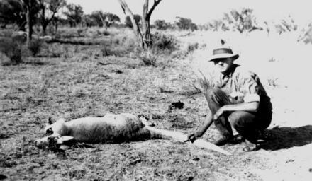 Keywords: StateLibQld 1 166063 Kangaroo hunting, Thylungra, 1924.jpg en Kangaroo hunting Thylungra 1924 Man posing with a dead kangaroo at Thylungra in 1924 The man is holding a knife suggesting he may be about to skin the animal 1924-08-01 handle 10462/deriv/112722 Item is held by John Oxley Library State Library of Queensland PD-Australia StateLibQld-License people in 1924 Unidentified Macropus Farms in Australia 1924 in Australia Black and white photographs Hunting in Australia Dead kangaroos Kangaroo hunting Hunters with their kill |
