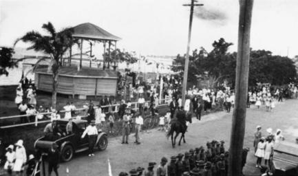 Keywords: StateLibQld 1 171811 Wynnum Central Beach Bandstand, ca. 1929.jpg en Wynnum Central Beach Bandstand ca 1929 The street scene in front of the bandstand shows people mingling with a horse and a motor vehicle Soldiers are standing in two lines in the foreground circa 1929 handle 10462/deriv/106847 Item is held by John Oxley Library State Library of Queensland PD-Australia StateLibQld-License Bandstands in Australia Vehicles in Australia Military people of Australia Wynnum Queensland 1929 in Queensland Black and white photographs |