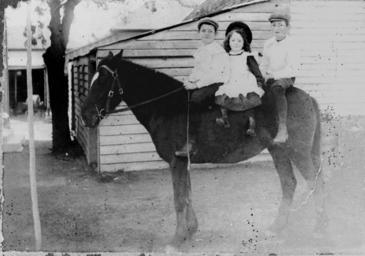 Keywords: StateLibQld 1 174427 Children of the Cavanagh family, Roma, on a horse.jpg en Children of the Cavanagh family Roma on a horse Children of the Cavanagh family Roma posing on a horse They are left to right Mervyn Nena and Ken The boys wear caps shirts shorts stockings and boots Nena wears a hat pinafore dress stockings and boots A building stables and tree-trunk can be seen in the background circa 1903 handle 10462/deriv/100040 Item is held by John Oxley Library State Library of Queensland PD-Australia StateLibQld-License Children of Queensland Families of Australia Black and white photographic portraits of children Children's clothing of Australia Equestrian portrait photographs Roma Queensland 1903 in Australia Black and white photographs |