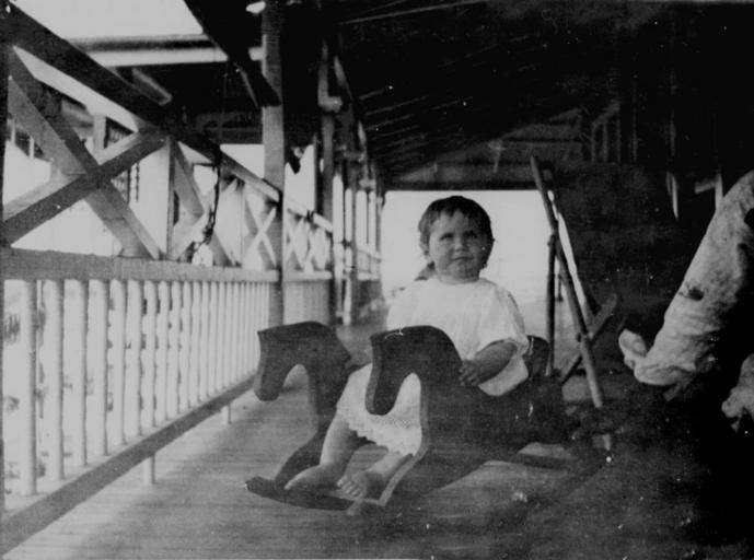 | Keywords: StateLibQld 1 179255 Althea Cook at Greenmount, Queensland, 1910-1920.jpg en Althea Cook at Greenmount Queensland 1910-1920 Althea Cook at Greenmount near Balnagowan Queensland 1910-1920 She sits in a child's rocking chair on the verandah The wooden railing and ceiling can be seen A deck chair is on the left An adult grasps a corner of the rocking chair between 1910 1920 handle 10462/deriv/103250 Item is held by John Oxley Library State Library of Queensland PD-Australia StateLibQld-License Children of Queensland Children's clothing of Australia 1910 in Australia Black and white photographs Rocking horses Veranda furnishings Queensland Balnagowan Station |