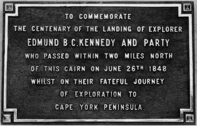 | Keywords: StateLibQld 1 193451 Commemorative stone for Edmund B. C. Kennedy, unveiled at Cardwell, 1948.jpg en Commemorative stone for Edmund B C Kennedy unveiled at Cardwell 1948 In 1848 the Assistant-Surveyor of New South Wales Edmund Kennedy led an expedition to explore Cape York Peninsula In the previous year he had discovered the Thomson River and established that the Barcoo River was part of Cooper's Creek Arriving at Rockingham Bay north of Townsville in May Kennedy's party reached Weymouth Bay where they established a depot Kennedy with four others Costigan Dunn Luff and a indigenous Australian Jacky Jacky left this depot in an endeavour to reach Cape York where a relief ship was expected 1948 handle 10462/deriv/113753 Item is held by John Oxley Library State Library of Queensland PD-Australia StateLibQld-License Edmund Kennedy Monuments and memorials in Queensland Cardwell Queensland 1948 in Australia New South Wales Black and white photographs |