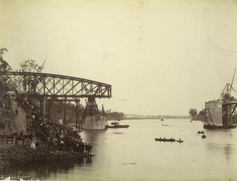 | Keywords: StateLibQld 1 233387 Construction of the Indooroopilly Railway Bridge on the Brisbane River, ca. 1895.jpg en Construction of the Indooroopilly Railway Bridge on the Brisbane River ca 1895 Crowds gather to watch the hulk Beatrice used on the Brisbane River to float another span on the Indooroopilly Railway Bridge The second Indooroopilly Railway Bridge was opened on August 17 1895 It replaced the Albert Railway Bridge which was washed away in the 1893 flood The bridge was designed by Henry Charles Stanley Chief Engineer of Railways and at the time was the largest bridge in Australia which was wholly of local manufacture The bridge consisted of two steel spans supported on abutments of masonry and a central concrete pier encased in an iron caisson to low water mark and then built up with masonry to the bearings of the girders Each span was 10 3 m long and each weighed about 610 tonnes A neatly designed footway was carried on the bridge's upstream side Stanley's bridge is still in use today although it has been supplemented with an adjacent bridge to cope with increased traffic Information taken from Janet Hogan Living history of Brisbane 1982 circa 1895 handle 10462/deriv/32094 Item is held by John Oxley Library State Library of Queensland PD-Australia StateLibQld-License Albert Bridge Brisbane construction Ships of Australia Brisbane River Crowds in Australia Black and white photographs of Australia in the 1890s 1895 in Brisbane |