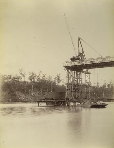 | Keywords: StateLibQld 1 233403 Indooroopilly Railway Bridge approaching the southern bank of the Brisbane River, 1895.jpg  en Indooroopilly Railway Bridge approaching the southern bank of the Brisbane River 1895 The second Indooroopilly Railway Bridge was opened on August 17 1895 It replaced the Albert Railway Bridge which was washed away in the 1893 flood The bridge was designed by Henry Charles Stanley Chief Engineer of Railways and at the time was the largest bridge in Australia which was wholly of local manufacture The bridge consisted of two steel spans supported on abutments of masonry and a central concrete pier encased in an iron caisson to low water mark and then built up with masonry to the bearings of the girders Each span was 10 3 m long and each weighed about 610 tonnes A neatly designed footway was carried on the bridge's upstream side Stanley's bridge is still in use today although it has been supplemented with an adjacent bridge to cope with increased traffic Information taken from Janet Hogan Living history of Brisbane 1982 circa 1895 handle 10462/deriv/32124 Item is held by John Oxley Library State Library of Queensland PD-Australia StateLibQld-License Albert Bridge Brisbane construction Boats in Australia Cranes in Australia 1895 in Queensland Black and white photographs |