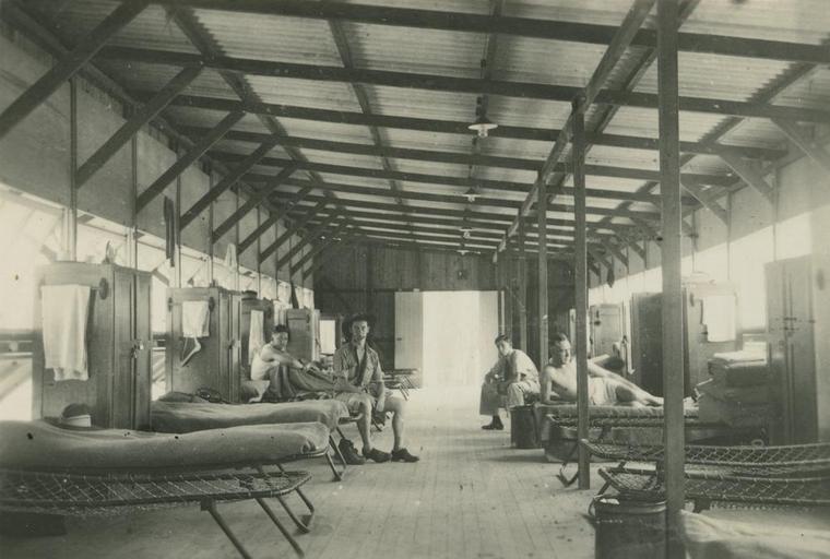 Keywords: StateLibQld 1 244836 Army barracks at Kelvin Grove, Brisbane during WWII.jpg en Army barracks at Kelvin Grove Brisbane during WWII Four unidentified soldiers relaxing in their hut at the Kelvin Grove barracks Photograph shows the camp cots wardrobes and the interior of corrugated iron and timber huts circa 1940 handle 10462/deriv/118340 Item is held by John Oxley Library State Library of Queensland Contributor s Green Photographic Studio PD-Australia StateLibQld-License Building interiors in Queensland Barracks in Australia Wardrobes Military people of Australia Kelvin Grove Queensland World War II home front in Brisbane 1940 in Brisbane Black and white photographs Military life in World War II Gona Barracks |