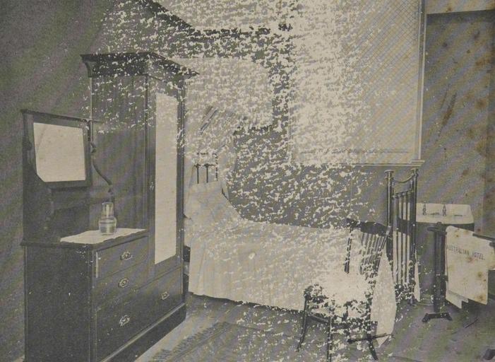 Keywords: StateLibQld 1 246585 Single guest bedroom at Vallely's Hotel Australian, Brisbane, ca. 1910.jpg en Single guest bedroom at Vallely's Hotel Australian Brisbane ca 1910 Vallely's Hotel Australian on the corner of Queen and Albert Streets Brisbane was etablished in 1869 The proprietor was Peter Vallely The bedroom has one single bed a combined wardrobe and dressing table a chair and a wash basin circa 1910 handle 10462/deriv/35699 Item is held by John Oxley Library State Library of Queensland PD-Australia StateLibQld-License Furniture in Australia Bedrooms in Australia Hotel Australian Brisbane 1910 in Australia Black and white photographs |