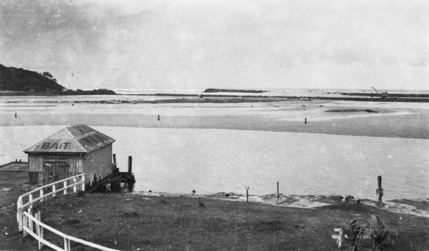 | Keywords: StateLibQld 1 294979 Bait shed on the Tweed River, ca. 1925.jpg en Bait shed on the Tweed River ca 1925 A hut on the edge of the river with a sign Bait written on its roof A white fence is seen leading to the hut circa 1925 handle 10462/deriv/150546 Item is held by John Oxley Library State Library of Queensland PD-Australia StateLibQld-License Headlands of Australia Tweed Heads New South Wales Tweed River New South Wales Estuaries in Tweed Heads Black and white photographs | ||||