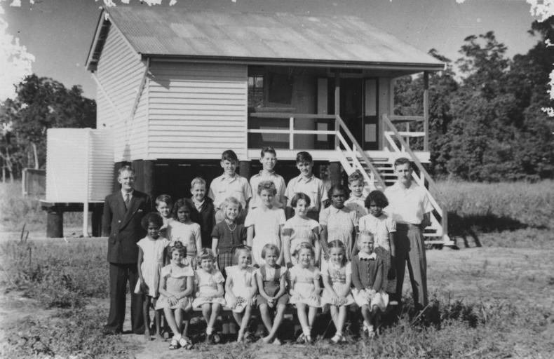 | Keywords: StateLibQld 1 389085 Riverside State School, 1953.jpg  en Riverside State School 1953 Back row from left George Udina Brice Henry Serge Udina Second row from left Mr Hardy Ted Digman Allan Millwood George Henry Mr Kelly Third row from left Kathleen Dickman Clara Kinjun Merle Henry Georgina Asplin Jeanette Warren Marjorie Kinjun Beryl Dickman Seated from left Alison Fleger Lynette Harris Margaret Niebling Shirley Asplin Christine Henry Barbara Henry Cheryl Fleger Small high set school building with one classroom The school has a corrugated iron roof and water tank a veranda and wooden stumps 1953 handle 10462/deriv/191908 Item is held by John Oxley Library State Library of Queensland PD-Australia StateLibQld-License Children's clothing of Australia Educators Black and white photographs State schools in Queensland Domestic rainwater tanks Queensland Tully Queensland 1953 in Queensland |
