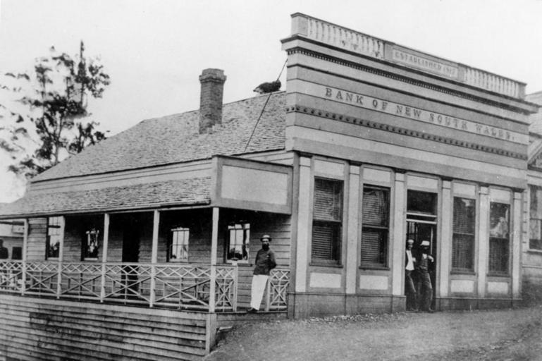 Keywords: StateLibQld 1 46728 Bank of New South Wales, Gympie, ca. 1872.jpg en Bank of New South Wales Gympie ca 1872 The bank is a wooden building with brick facade The side aspect of the bank has a verandah with decorative railings On either side of the street entrance the bank's sash windows are covered with wooden blinds Gympie is a city in south-eastern Queensland situated on the Mary River about 162 kilometres north of Brisbane Gympie is the centre of an important dairying and agricultural district In the early days timber was a significant industry circa 1872 handle 10462/deriv/55594 Item is held by John Oxley Library State Library of Queensland PD-Australia StateLibQld-License Facades in Australia Shingle roofs Verandas on Queensland bank buildings Black and white photographs Bank of New South Wales Gympie Images from the State Library of Queensland |