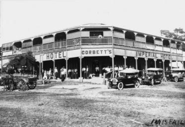 Keywords: StateLibQld 1 66491 Imperial Hotel, Innisfail, ca. 1920.jpg supplied with photograph A large crowd gathers under the hotel awning for this photograph Some vehicular traffic appears in the street circa 1920 handle 10462/deriv/77624 Item is held by John Oxley Library State Library of Queensland McTeggart J P PD-Australia StateLibQld-License Hotels and pubs in Innisfail Queensland Roads in Far North Queensland Automobiles of Australia Groups of people in Australia Black and white photographs |