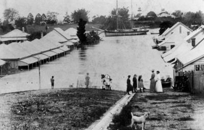 Keywords: StateLibQld 1 85624 Floods in Ferry Street, Kangaroo Point, Brisbane, Queensland, 1893.jpg en Floods in Ferry Street Kangaroo Point Brisbane Queensland 1893 <br /> Brisbane River in the 1893 flood at Ferry Street Kangaroo Point looking north to New Farm Brisbane Flood waters have submerged houses to a few feet below the roof line People have gathered to overlook the flood waters and a large sailing boat is anchored in the Brisbane River 1893 handle 10462/deriv/62722 Item is held by John Oxley Library State Library of Queensland PD-Australia StateLibQld-License Streets in Kangaroo Point Sailing ships in Queensland 1893 Brisbane flood Brisbane River Black and white photographs 19th-century photographs of Queensland |