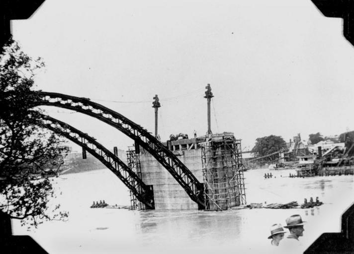 Keywords: StateLibQld 1 86040 Incomplete William Jolly Bridge photographed during the 1931 Brisbane flood.jpg en Incomplete William Jolly Bridge photographed during the 1931 Brisbane flood The William Jolly Bridge which linked North Quay on the north bank of the Brisbane River to Grey Street on the south bank photographed during the 1931 flood which temporarily halted its construction The bridge opened to traffic on 30 March 1932 known then as the Grey Street Bridge 'Amongst the interesting features of the Bridge the length of which is 1634 feet are the three main arches over the river of 238 ft centres each rib consisting of structural steel fabricated under a sub-contract let by Messrs M R Hornibrook Ltd to Messrs Evans Deakin and Co Brisbane This steelwork was designed to support the concrete during construction without falsework ' Information taken from Souvenir official opening of Grey Street Bridge 1932 1931-02-07 handle 10462/deriv/62772 Item is held by John Oxley Library State Library of Queensland PD-Australia StateLibQld-License William Jolly Bridge construction 1931 Brisbane flood Black and white photographs of bridges Black and white photographs of Brisbane |