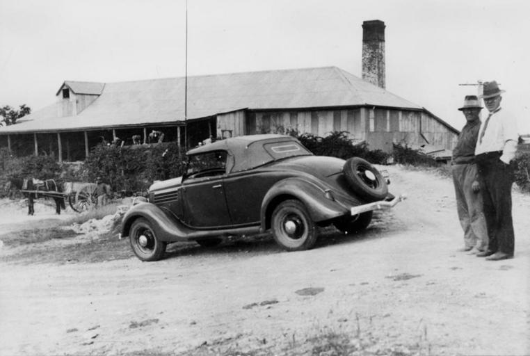 Keywords: StateLibQld 1 91132 Venus Crushing Works at Charters Towers, ca. 1935.jpg supplied with photograph The car in the photograph is a 1935 Ford V8 roadster powered by an 85hp 'flathead' V8 engine The car is set up with a large luggage compartment rather than having a 'dickey seat' in the rear compartment as was popular with many private owners circa 1935 handle 10462/deriv/65721 Item is held by John Oxley Library State Library of Queensland PD-Australia StateLibQld-License Vehicles in Australia Ford V8 People of Charters Towers Mines in Charters Towers Black and white photographs |