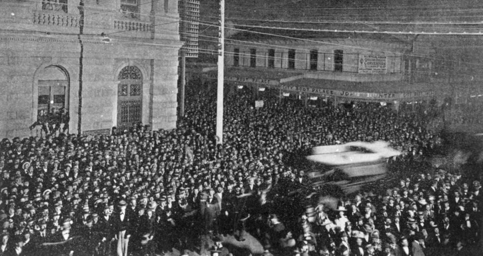 | Keywords: StateLibQld 2 104324 Huge crowd of people gathered at the intersection of Queen and Edward Streets, Brisbane, waiting for the results of the 1899 Federation Referendum.jpg en Huge crowd of people gathered at the intersection of Queen and Edward Streets Brisbane waiting for the results of the 1899 Federation Referendum Caption 'The crowd watching the result board at the Courier building on Saturday night' Large crowd of people gathered at the intersection of Queen and Edward Streets on 9 September 1899 awaiting the results of the Federation referendum Queensland voted 'no' to joining the rest of the states in a Federation Hunter's Boot Palace can be seen in the background 1899-09-01 handle 10462/deriv/90171 The Queenslander 9 September 1899 p 525 Poulsen PD-Australia StateLibQld-License Black and white photographs Federation of Australia Edward Street Brisbane Queen Street Brisbane Crowds in Australia 1899 in Queensland Referendums in Australia Images from The Queenslander |