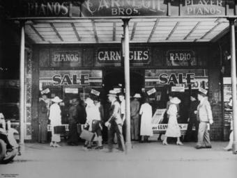 Keywords: StateLibQld 2 107336 Shop front of Carnegie Brothers showroom in Queen Street, Brisbane, 1935.jpg en Shop front of Carnegie Brothers showroom in Queen Street Brisbane 1935 Window display of Carnegie Brothers showroom at 210 Queen Street Brisbane 1935 Pedestrians appear in the foreground Carnegie Brothers were music and musical instrument dealers Information taken from Queensland Post Office Directory 1930-31 1935 handle 10462/deriv/91842 Item is held by John Oxley Library State Library of Queensland PD-Australia StateLibQld-License Black and white photographs Queen Street Brisbane 1935 in Queensland Music stores |