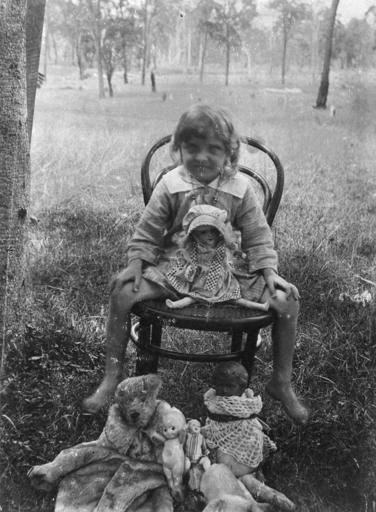 Keywords: StateLibQld 2 145467 Girl on a chair outside with dolls.jpg en Girl on a chair outside with dolls Girl sitting astride a wooden chair on the grass with dolls and teddy bears She wears a dress and has bare feet and shares the seat with a doll The other toys lie on the ground in front of the chair A postcard supplied with the photograph headed' Betty' reads Dear Beat I don't know who is the culprit you or I but it is since I heard from though I think of you constantly This was taken in the yard is cetainly not flattering but is recognisable the 21st anniversary of your wedding day We are all well send much love Write a few lines soon 'Etta 1921-06-06 handle 10462/deriv/22201 Item is held by John Oxley Library State Library of Queensland PD-Australia StateLibQld-License Images of postcards from the State Library of Queensland Black and white photographs Portraits of Queensland Children of Queensland Dolls from Australia 1921 in Australia Teddy bears |
