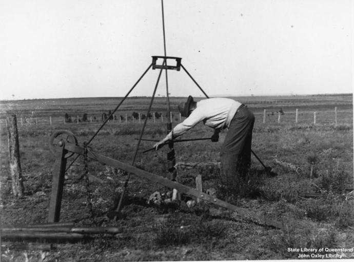 Keywords: StateLibQld 2 159182 Man, aided by machinery, digging post holes in the Blackall District, Queensland, 1900-1910.jpg en Man aided by machinery digging post holes in the Blackall District Queensland 1900-1910 Man using a large drill-like piece of equipment to dig post holes in the Blackall District in the early 1900s between 1900 1910 handle 10462/deriv/7257 Item is held by John Oxley Library State Library of Queensland PD-Australia StateLibQld-License Black and white photographs Drilling machines 1900 in Australia Holes |