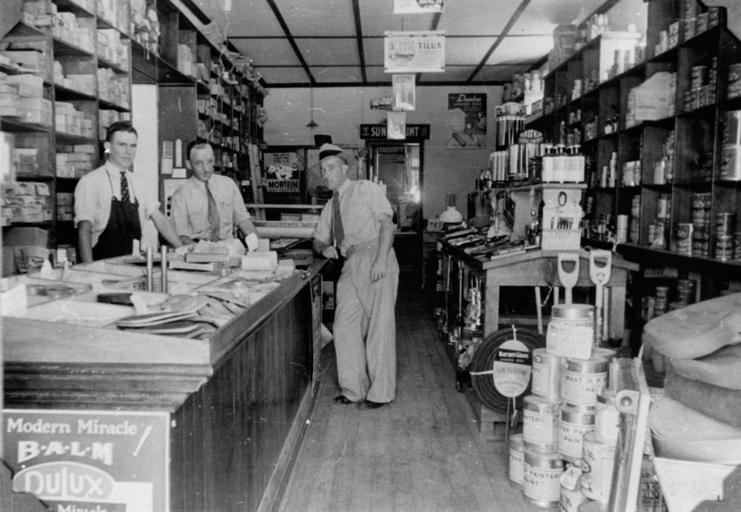Keywords: StateLibQld 2 184151 Over the counter at the Downs Hardware Store, Dalby, 1937.jpg en Over the counter at the Downs Hardware Store Dalby 1937 Interior or the hardware shop in Dalby with abundant stock including paint gardening tools sandpaper and assorted tools The floor to ceiling shelving is full of cardboxes boxes of hardware 1937 handle 10462/deriv/127037 Item is held by John Oxley Library State Library of Queensland PD-Australia StateLibQld-License Building interiors in Queensland Advertisements in Australia Hardware shops in Australia Men's clothing of Australia Black and white photographs Merchants from Australia Dalby Queensland 1937 in Australia Shopkeepers