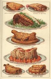 Keywords: StateLibQld 2 191859 Elaborate cuts of roast meat presented on silver platters, 1901.jpg en Elaborate cuts of roast meat presented on silver platters 1901 Mrs Beeton was considered to be the authority in the cookery field in the colonies and hostesses aspired to serve such dishes to their guests 1901 handle 10462/deriv/114610 Copied and digitised from an image appearing in I M M Beeton Mrs Beeton's cookery book 1901 PD-Australia StateLibQld-License Platters with food Meat dishes of Australia 1901 in Queensland Mutton Lamb meat Beef Mrs Beeton's Book of Household Management Platters in art Meats in art |