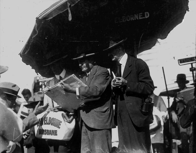 Keywords: StateLibQld 2 195371 Bookmakers in action in the ring at the races, Brisbane 1932.jpg supplied with photograph 1932 handle 10462/deriv/115235 Item is held by John Oxley Library State Library of Queensland PD-Australia StateLibQld-License Beach umbrellas in Australia Men's clothing of Australia Black and white photographs Horse racing in Australia Racecourses in Queensland 1932 in Brisbane Bookmakers People with binoculars |
