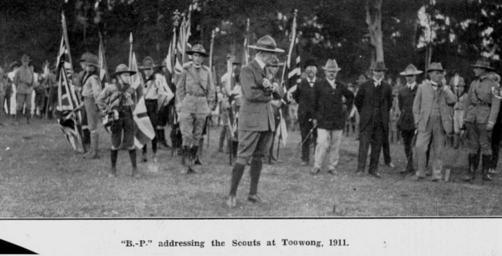 Keywords: StateLibQld 2 198103 Lord Robert Baden-Powell, founder of the Scouting movement, addressing a group of Scouts at Toowong, Brisbane, 1911.jpg en Lord Robert Baden-Powell founder of the Scouting movement addressing a group of Scouts at Toowong Brisbane 1911 Caption 'B -P ' addressing the Scouts at Toowong 1911 1911 handle 10462/deriv/94632 Item is held by John Oxley Library State Library of Queensland PD-Australia StateLibQld-License Military uniforms of Australia Black and white photographs Children of Queensland Toowong Queensland 1911 in Australia Scouting in Australia Robert Baden-Powell |