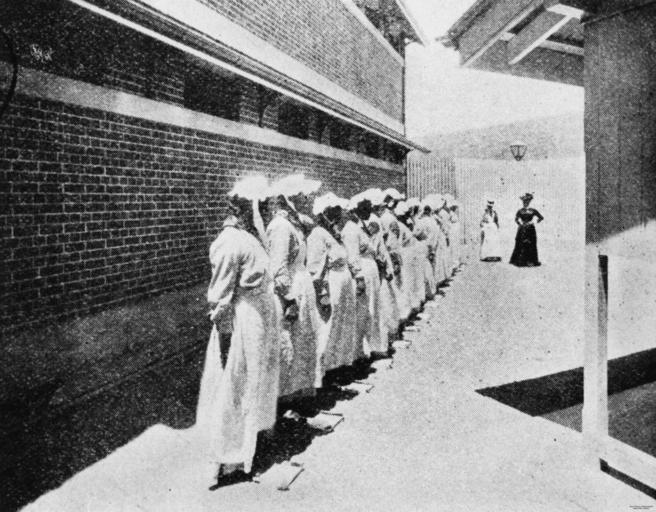 Keywords: StateLibQld 2 67803 Kit inspections at the new female division of the Boggo Road Gaol, Brisbane, 1903.jpg en Kit inspections at the new female division of the Boggo Road Gaol Brisbane 1903 Female prisoners are standing in a line having their kits inspected at the new women's prison A full prisoner's kit consisted of a chemise; a blue and white striped petticoat; a gown; a pair of coarse white stockings all branded ; a red cotton pocket handkerchief; a white apron; and a white mob cap with frills and strings to be tied under the chin Other items were a pair of strong lace-up boots; a comb; a spoon; and a navy blue and white kerchief for the neck Information taken from The Queenslander 28 November 1903 p 21 1903 handle 10462/deriv/84448 The Queenslander 28 November 1903 p 22 PD-Australia StateLibQld-License Military uniforms of Australia Black and white photographs Prisons in Queensland Women of Australia 1903 in Australia Boggo Road Gaol Female prisoners |
