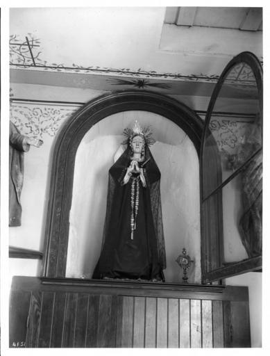 Keywords: Statue of "Nuestra Senora" (Our Lady of Sorrow) at the Presidio Church at Mission San Carlos Borromeo, Monterey, ca.1906 (CHS-4151).jpg en <br> Statue of Nuestra Señora Our Lady of Sorrow at the Presidio Church at Mission San Carlos Borromeo Monterey ca 1906 Photograph of a statue of Nuestra Señora Our Lady of Sorrow at the Presidio Church at Mission San Carlos Borromeo Monterey ca 1906 The beseeching figure stands with hands clasped A crown of light rays eminates from her head The glass door to the alcove inset in the wall is open A small cross containing a relic sits at the feet of the statue at right A wooden cabinet is inset below the statue Two other figures stand at either side Ornamental painting is on the walls and ceiling Call number CHS-4151 Legacy record ID chs-m16652; USC-1-1-1-14075 Photographer James George Wharton Filename CHS-4151 Coverage date circa 1906 Part of collection California Historical Society Collection 1860-1960 Type images Geographic subject city or populated place Carmel Repository name USC Libraries Special Collections Accession number 4151 Microfiche number 1-126-17 Archival file chs_Volume96/CHS-4151 tiff Part of subcollection Title Insurance and Trust and C C Pierce Photography Collection 1860-1960 Repository address Doheny Memorial Library Los Angeles CA 90089-0189 Geographic subject country USA Format aacr2 3 photographs glass photonegative photoprints b w ; 22 x 17 cm Rights Digitally reproduced by the USC Digital Library; From the California Historical Society Collection at the University of Southern California Subject adlf religious facilities Project USC Repository email specol usc edu Identifying number plate no 64-G Contributing entity California Historical Society Date created circa 1906 Publisher of the digital version University of Southern California Libraries Format aat photographic prints; photographs Geographic subject state California Subject file heading Missions -- Mission Carmel San Carlos Borromeo de Carmelo ; Mission Carmel -- San Carlos Borromeo de Carmelo Format glass plate negatives Access conditions Send requests to address or e-mail given Phone 213 821-2366; fax 213 740-2343 Geographic subject county Monterey Subject lcsh Missions Spanish Subject Carmel Mission 1906 James George Wharton http //digitallibrary usc edu/cdm/ref/collection/p15799coll65/id/16586 PD-old-70-1923 Images from USC Digital Library uploaded by Fæ California Historical Society Collection 1860-1960 Glass plate negatives Photographs by George Wharton James Interior of Mission San Carlos Borromeo de Carmelo Statues of Virgin Mary in the United States |