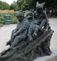 Keywords: statue outside children sled outdoors bronze sculpture iron art architecture city old history landmark outdoor town green historic tourism park monument structure