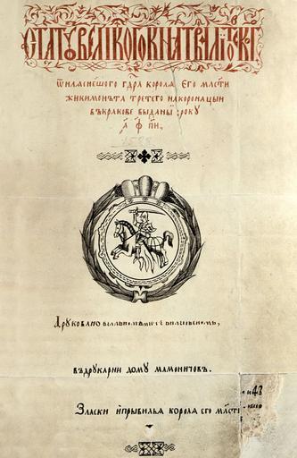 | Keywords: Statut VKL. Статут ВКЛ.jpg Т эцяга Статуту Вялікага Княства Літоўскага Vilnia University Library author 1588 <gallery> File Statut Vialikaha Kniastva Litoŭskaha Статут Вялікага Княства Літоўскага jpg File Statut-1588 jpg </gallery> PD-old-100 Statut of Grand Duchy of Lithuania 1588 |