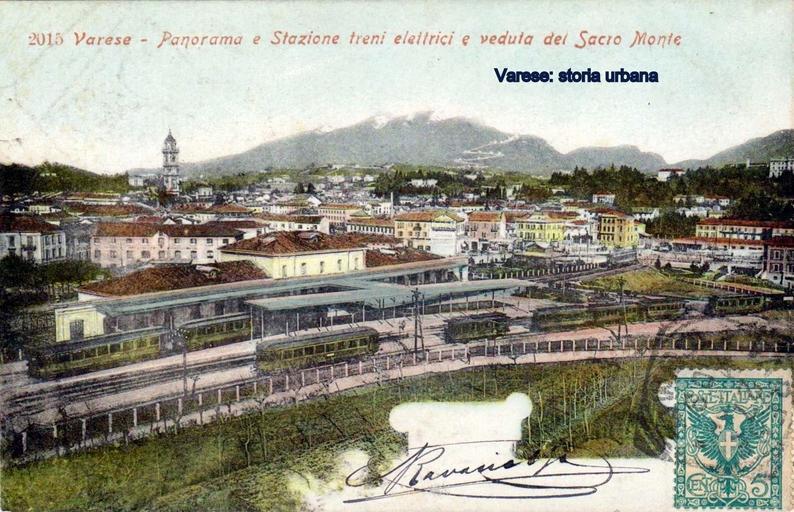 Keywords: Versione colorata. Immagine presa da Giubiano, in basso a sinistra la stazione delle Ferrovie dello Stato (1865), alle sue spalle lo stabilimento della Carrozzeria Macchi e la cupola del Politeama. Più a destra l'imbocco di via Morosini con l'albergo Isola Magenta, al centro l'edificio del Calzaturificio di Varese. varese |