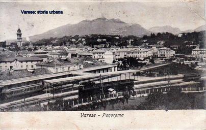 Keywords: Immagine presa da Giubiano, in basso a sinistra la stazione delle Ferrovie dello Stato (1865), alle sue spalle lo stabilimento della Carrozzeria Macchi e la cupola del Politeama. A destra l'imbocco di via Morosini con l'albergo Isola Magenta, all'estrema destra l'edificio del Calzaturificio di Varese.