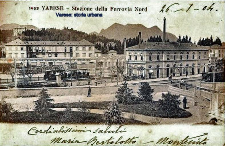 Keywords: La stazione delle Ferrovie Nord Milano (1885) e il capolinea della tranvia per la Prima Cappella (1895) con un convoglio fermo. Sul piazzale con aiuole davanti alla stazione (odierna piazza Kennedy) è in costruzione una cancellata. Di fronte alla stazione lo stabilimento del Calzaturificio di Varese e le ciminiere dei Molini Marzoli Massari. tram varese |